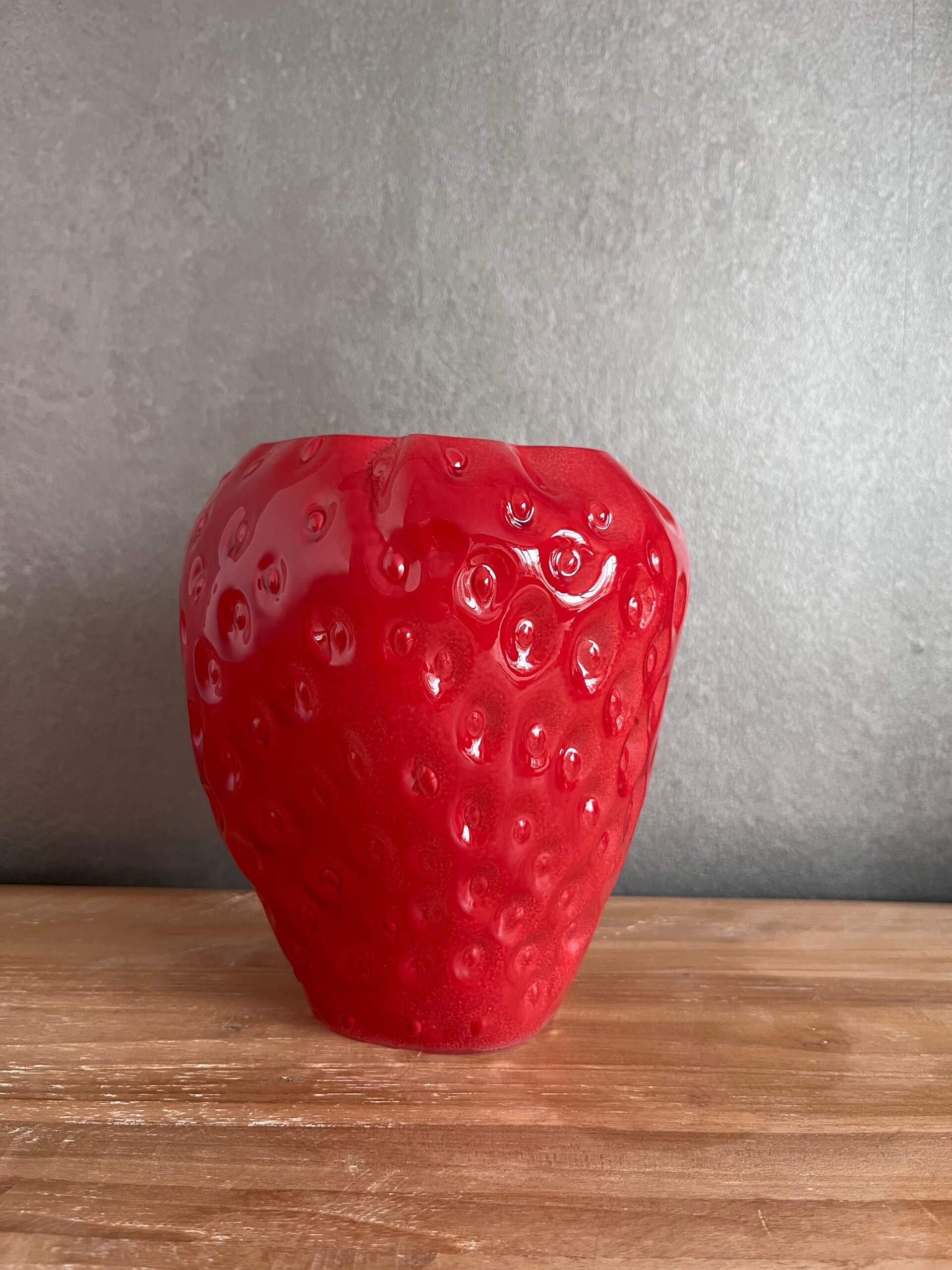 Aardbeien vaas is de kleur opal red. Hoogte van de vaas is 16 cm